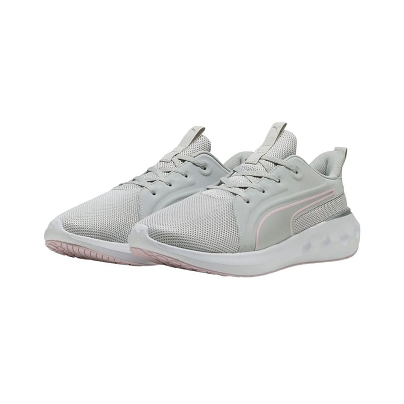 Con un diseño moderno en tonos gris claro frío, malva rosa y plata Puma, combina funcionalidad y estilo, permitiendo que las corredoras luzcan un calzado atractivo y profesional durante sus entrenamientos.