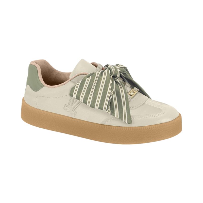 Este champion de corte bajo presenta una base en color beige claro, que aporta neutralidad y combina fácilmente con distintos estilos. El detalle en verde oliva en el talón agrega un contraste sutil, mientras que su elemento más llamativo —un gran lazo de tela a cuadros verdes y blancos que funciona como cordón decorativo— le da un aire fresco, original y femenino. En el centro del moño, un adorno metálico dorado resalta el sello elegante de la marca. La suela de goma gruesa color caramelo, con diseño robusto, aporta estabilidad y completa el look con un estilo urbano.