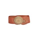 Cinturón elástico ancho en tono cuero terracota, pensado para adaptarse cómodamente a la silueta.