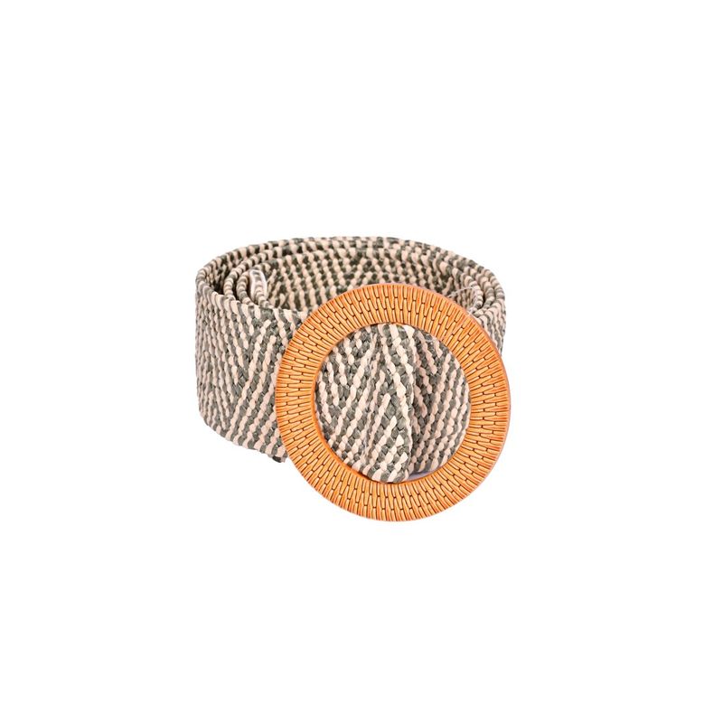 El Cinto Yute Rayas Verde Mujer es un accesorio que combina estilo natural y artesanal con un diseño versátil y moderno. Su estructura ancha en tela tejida con patrón de espiga aporta textura y personalidad, mientras que la hebilla circular grande en madera clara añade un detalle distintivo que realza cualquier look.