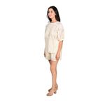 El short tipo pollera de tiro alto completa el conjunto, con bajo festoneado que añade un detalle artesanal y elegante. Su corte permite libertad de movimiento, mientras que la cintura alta estiliza la figura y proporciona un ajuste cómodo. Este conjunto logra un equilibrio perfecto entre comodidad y sofisticación, adaptándose a distintas ocasiones informales y sociales.