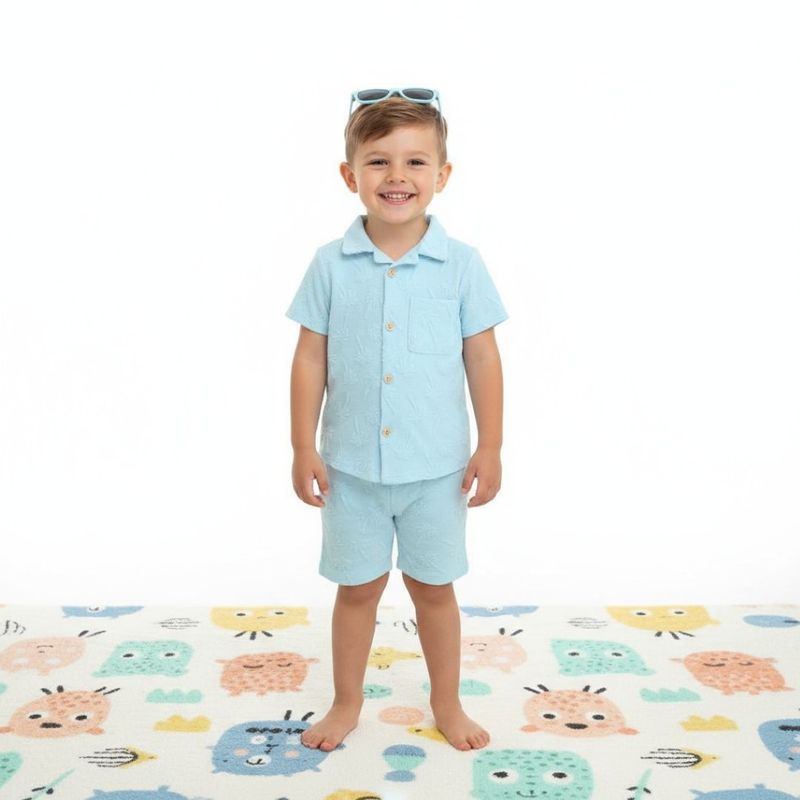 Este Conjunto Camisa Con Bermuda Lente De Sol Azul Claro Niño Tiny Tots es la elección ideal para padres que buscan un conjunto completo, cómodo, moderno y seguro, pensado para disfrutar del verano al máximo.