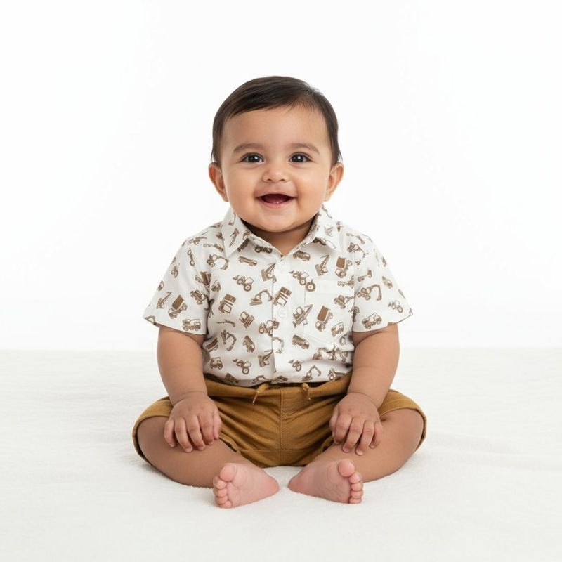 El Conjunto Camisa Marfil Con Bermuda Marrón Niño Tiny Tots es una propuesta ideal para los más pequeños que buscan comodidad y estilo en un solo conjunto. Esta prenda de dos piezas combina una camisa de manga corta color marfil con un encantador estampado de vehículos de construcción en tonos marrones, y una bermuda lisa color marrón dorado con cintura elástica y cordón de ajuste, que brinda un calce adaptable y seguro.