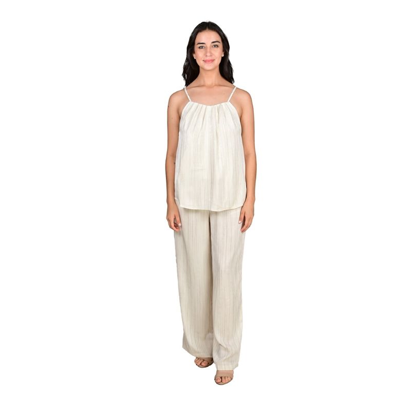 Este conjunto de dos piezas de Fashion Celina combina elegancia, comodidad y frescura para crear un look versátil y sofisticado. La camisilla de tirantes finos cuenta con un detalle fruncido en el escote, aportando un toque femenino y delicado, mientras que el pantalón palazo de pierna muy ancha ofrece una caída fluida y un ajuste cómodo, estilizando la silueta de manera natural. Las sutiles rayas verticales en el tejido aportan dinamismo y elongación visual, haciendo que el conjunto sea ideal tanto para ocasiones formales como informales.