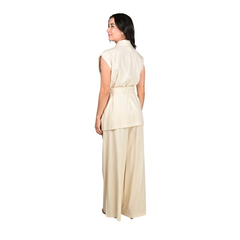 El pantalón palazo de tiro alto y pierna recta ofrece un diseño fluido que alarga visualmente las piernas y garantiza total comodidad durante el uso. Su corte amplio permite libertad de movimiento, ideal para actividades que requieren versatilidad sin sacrificar el estilo. La combinación de chaleco y palazo crea un look armonioso, contemporáneo y sofisticado, apto tanto para el trabajo como para eventos sociales.