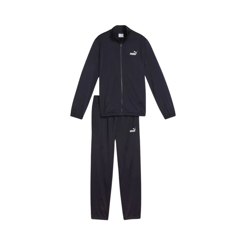 Está compuesto por una chaqueta de manga larga y un pantalón largo, ambos en un elegante tono azul marino que aporta versatilidad y sobriedad. La chaqueta cuenta con un cierre frontal de cremallera que sube hasta el cuello ligeramente alto, brindando mayor cobertura y protección en días frescos. Sus puños ajustados favorecen un calce cómodo y seguro. El logo de Puma bordado en color blanco en el pecho izquierdo refuerza su estilo deportivo y moderno.