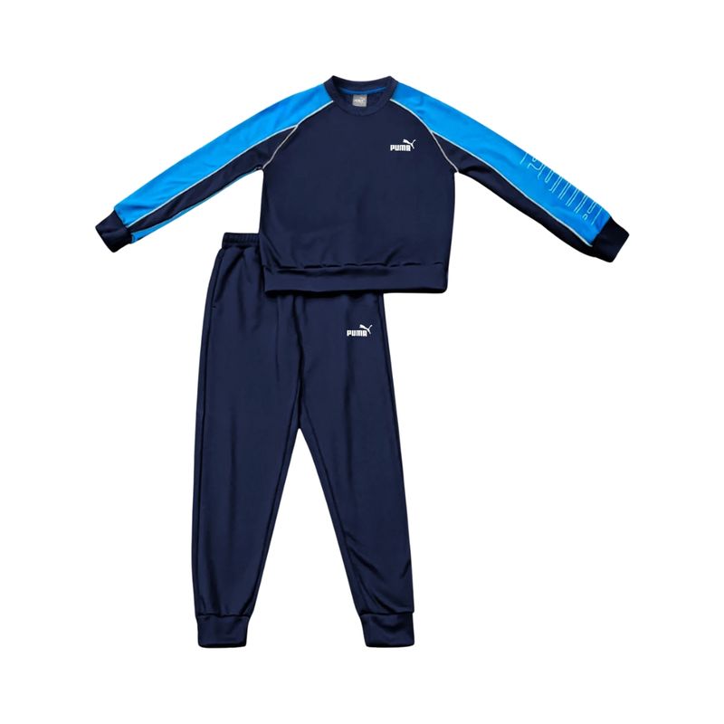 Compuesto por una sudadera de manga larga y un pantalón largo, el conjunto se presenta en una llamativa combinación de tonos azul marino y turquesa. La sudadera destaca por su diseño con mangas raglán en color turquesa, que contrastan con el cuerpo azul oscuro, brindando un efecto visual moderno y juvenil. Cuenta con cuello redondo, puños y dobladillo inferiores en azul oscuro, con sutiles detalles en azul brillante que realzan el conjunto. En el pecho izquierdo se encuentra el logo Puma estampado en color blanco, y en la manga derecha, la palabra "PUMA" aparece en formato vertical, reforzando el estilo deportivo de la prenda.