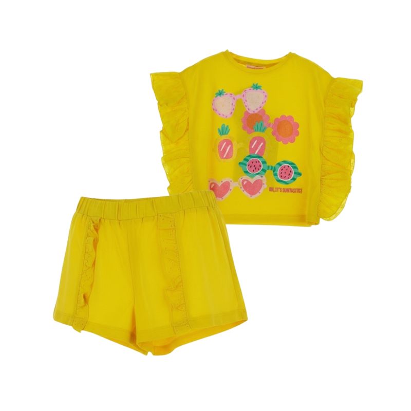 El Conjunto Manga Corta Estampado Frutas Amarillo Niña Original Marines combina diversión y comodidad para los días cálidos. La remera cuenta con volantes en las mangas y un estampado veraniego de frutas y gafas que aporta un toque alegre y fresco. El pantalón corto de cintura elástica incluye volantes decorativos laterales, completando un look coordinado y moderno para las niñas.
