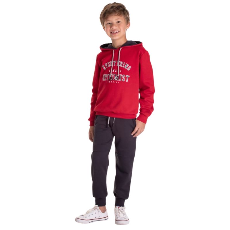 La prenda superior es una sudadera de manga larga con capucha, diseñada con un corte cómodo y moderno. Presenta un diseño gráfico con texto en el pecho que aporta un aire juvenil y actual, ideal para niños con personalidad y actitud. El interior de la capucha tiene un contraste de color sutil que le suma estilo al conjunto. Su confección con materiales resistentes y duraderos asegura un uso prolongado sin perder calidad ni forma, incluso después de varios lavados.