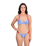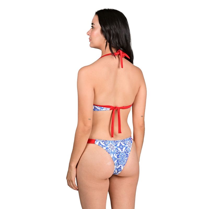 Corpiño de bikini con copas preformadas y aros que ofrecen soporte, realce y un ajuste confortable para todo tipo de cuerpo. Presenta un elegante estampado de azulejos azules y blancos, complementado con tirantes finos rojos que se anudan detrás del cuello, permitiendo un ajuste personalizado y seguro. El cierre posterior con lazo rojo en la espalda añade un detalle delicado y femenino, mientras que el diseño general garantiza comodidad y estilo durante el uso en playa o piscina.