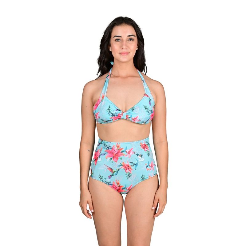 Corpiño femenino con estampado floral de hibiscos rosas y colibríes sobre fondo turquesa, diseñado para aportar un estilo fresco, veraniego y elegante. Presenta escote en V que realza el busto, y tirantes anchos que se anudan detrás del cuello, permitiendo un ajuste personalizado y cómodo. El cierre de lazo en la espalda asegura un soporte seguro y versatilidad en el ajuste según la preferencia de la usuaria.