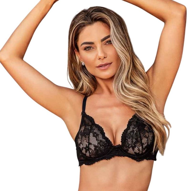 Corpiño confeccionado totalmente en delicado encaje, con arcos para reafirmar el busto con elegancia y la máxima comodidad, sin taza, breteles regulables con detalles de coquetos moñitos satinados, cierre por corchetes de 3 posiciones. Un exquisito corpiño que te llenará de confort realzando tu feminidad.