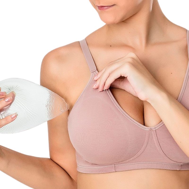 Este corpiño está confeccionado con bojo (copa) moldeado sin aro, lo que proporciona una estructura delicada y suave, evitando puntos de presión en la zona del busto. Su diseño incluye un bolsillo interno tipo sobre para insertar prótesis mamarias, brindando seguridad y estabilidad durante el uso.