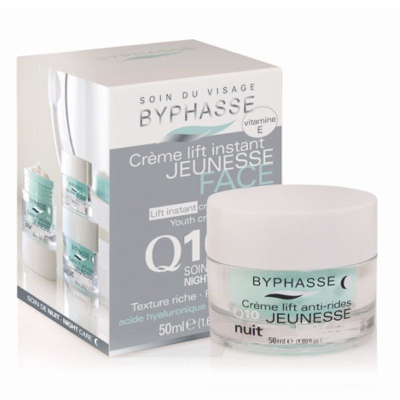 Adopta una «rutina de belleza» gracias a nuestra nueva gama de cremas faciales 24 horas y Q10. La crema de noche Lift Instant BYPHASSE asocia la coenzima Q10, un activo reafirmante eficaz, con el ácido hialurónico que mejora la elasticidad de la piel