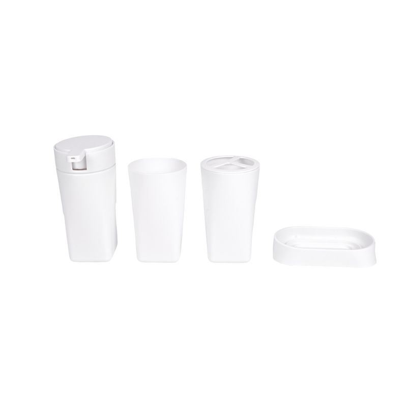 Juego de accesorios de baño en color blanco, compuesto por cuatro piezas funcionales: un dispensador de jabón líquido, dos vasos (uno con separadores para cepillos de dientes) y una jabonera. Su diseño minimalista y limpio se adapta a cualquier estilo de baño, brindando orden y practicidad.