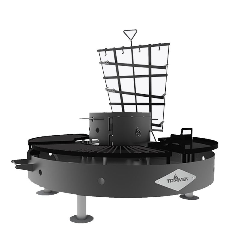 Alto: 130 cm Profundidad: 110 cm Peso total: 80 kg Diámetro de 1,2mts Accesorios: Módulos de parrilla enlozado. Módulo de plancha enlozado. Fogón móvil. Una estaca cruz de 3 posiciones.