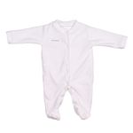 Este enterito incluye pies cubiertos, evitando la necesidad de usar medias adicionales y asegurando que el bebé esté siempre protegido y cómodo. Cuenta con un cuello redondo que brinda suavidad y evita rozaduras, y un cierre frontal completo con broches que facilita el cambio y garantiza un ajuste seguro.