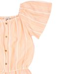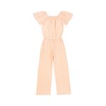 El enterito se distingue por su diseño a rayas blancas verticales sobre base naranja, que estiliza la figura y le da un aire divertido y llamativo, perfecto para combinar en cualquier ocasión urbana o casual.
