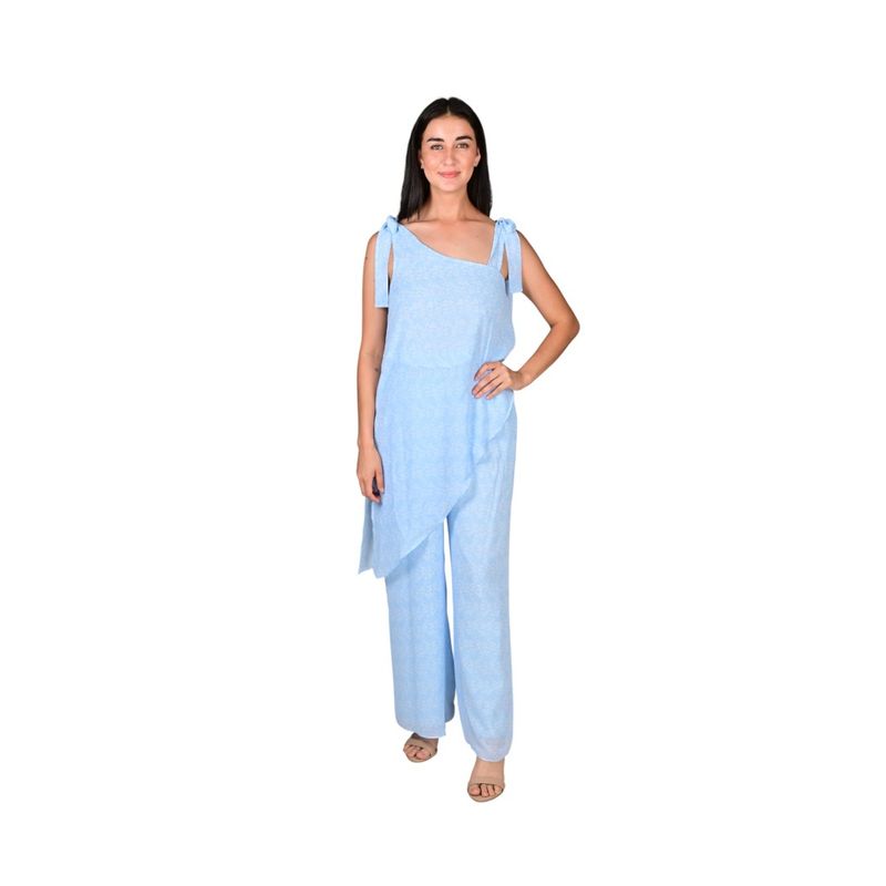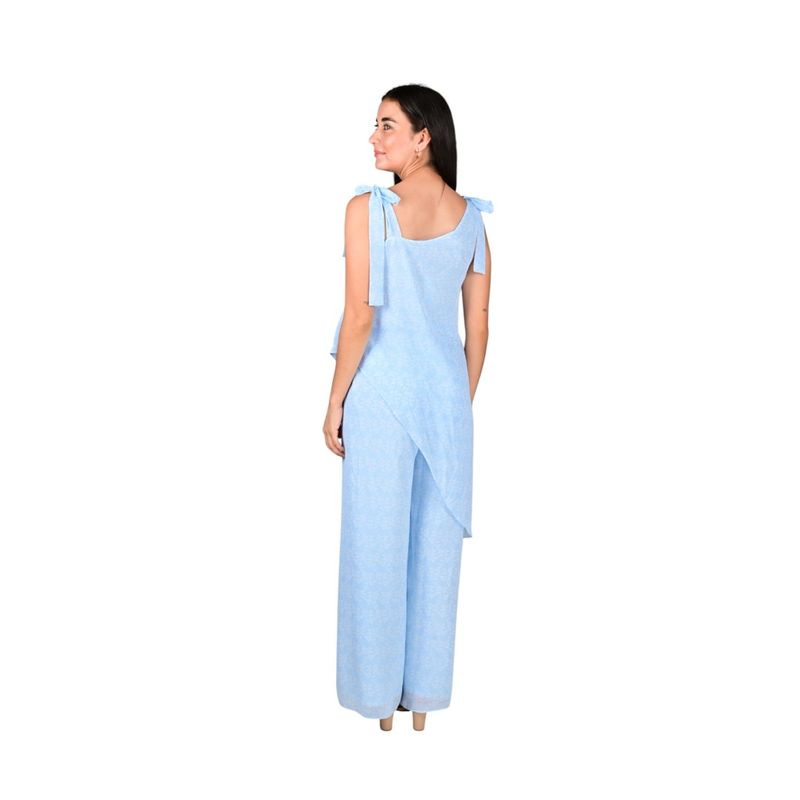 Enterizo femenino confeccionado en gasa ligera y fluida, que aporta frescura y comodidad para todo el día. Su estampado en tonos celestes genera un look delicado y veraniego, ideal para ocasiones casuales o salidas informales. El diseño de una sola pieza ofrece un ajuste relajado y elegante, destacando la silueta sin perder confort.