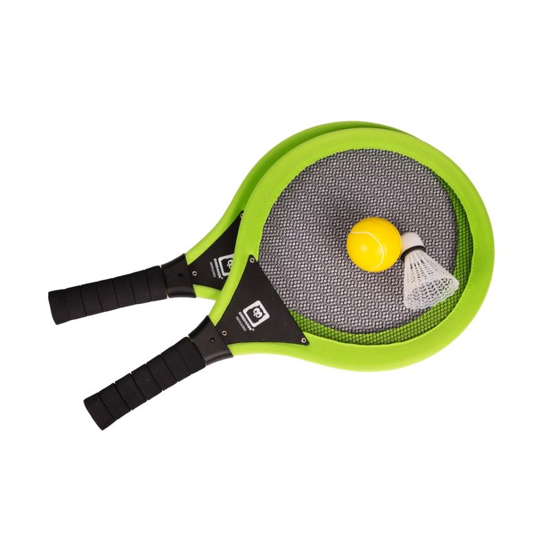 Incluye: 2 raquetas con red de tela, 1 pelota de bádminton y 1 pelota de tenis.