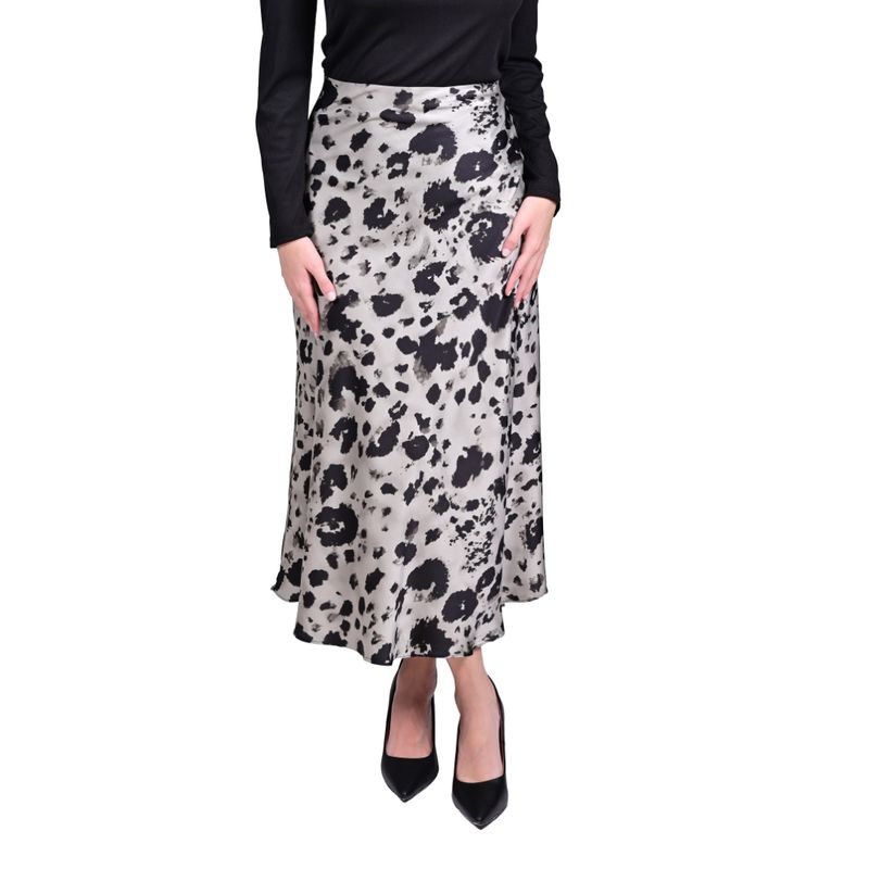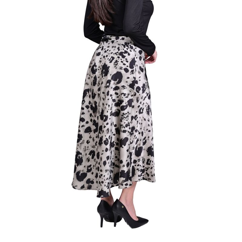 La falda midi L'exclusif destaca por su diseño elegante y contemporáneo. Con un corte a media pantorrilla y silueta acampanada, aporta movimiento y frescura a cada paso. Su estampado animal print, en base clara con manchas oscuras, le da un toque audaz y sofisticado que resalta la personalidad de cualquier look.