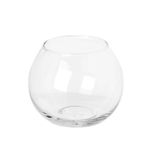 Cuenta con medidas aproximadas de 10 centímetros de diámetro y 8 centímetros de alto, un tamaño ideal para pequeños arreglos florales o como contenedor decorativo. Su forma de pecera permite múltiples usos, desde decoraciones con piedras de colores hasta velas flotantes.