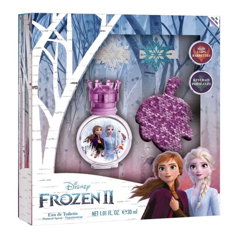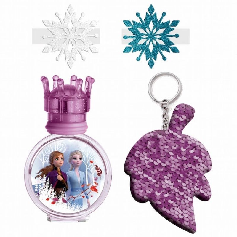 Disfruta de este conjunto único que te hará sentir como Anna y Elsa con su fragancia dulce y fresca y sus lindas pinzas para el cabello y llavero con purpurina.