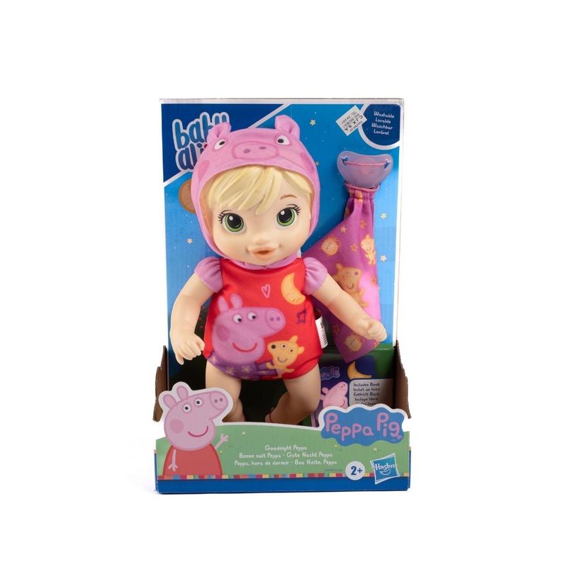 Baby Alive más Peppa Pig es igual a diversión. La muñeca bebé Peppa, hora de dormir de Baby Alive viene con una prenda de vestir incorporada que tiene una capucha de cerdita inspirada en Peppa. También incluye un libro de ilustraciones para dormir a Peppa, un chupete en forma de cerdito y una mantita de Peppa Pig.