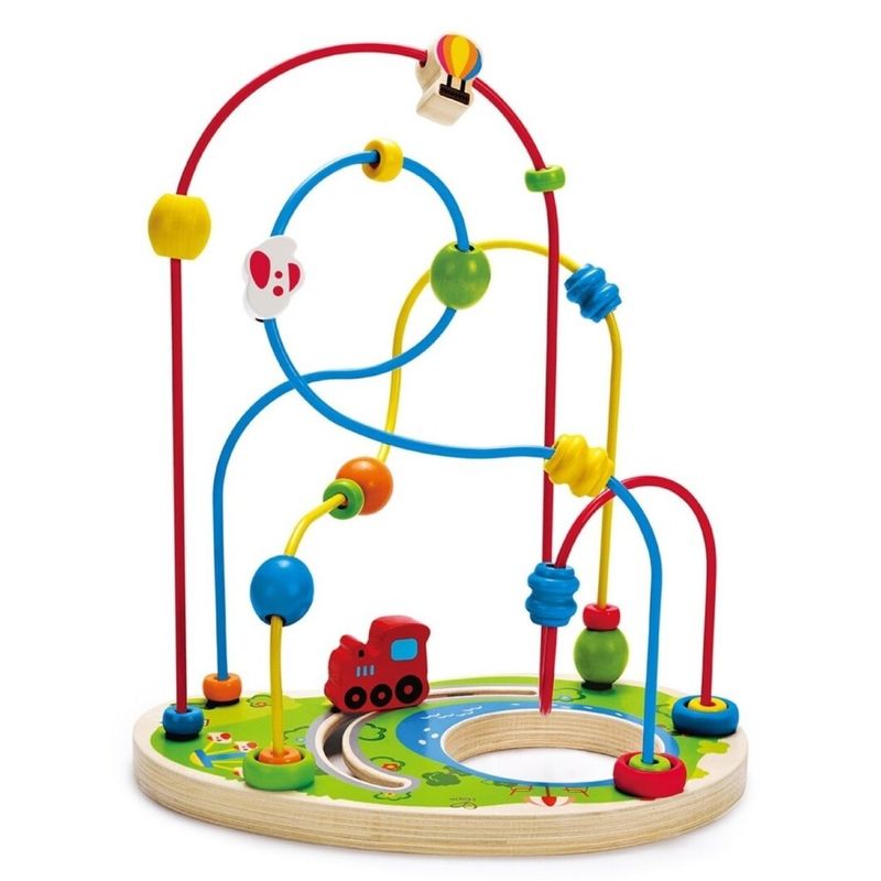 Por encima, por debajo, alrededor y a través. Cuentas de madera, anillos y caminos sinuosos crean infinitas formas de jugar.