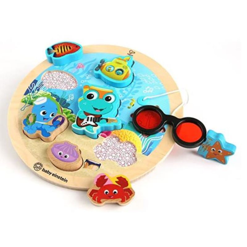 Un mundo submarino cobra vida ante los ojos de tu bebé. El rompecabezas de madera Baby Einstein y Hape es una versión reinventada de un juguete clásico. ¡Sumérgete más y tu pequeño descubrirá un nuevo nivel de diversión detrás de cada pieza con gafas mágicas! Cuando el bebé use los anteojos, revelará nuevas imágenes ocultas debajo de las formas del mar. Neptuno y sus amigos introducirán formas a medida que trabaja para encajar cada pieza gruesa en el lugar correcto.
