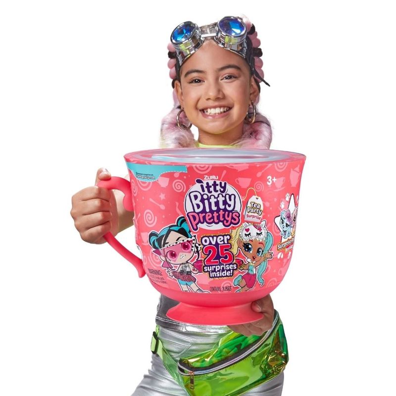 *ITTY BITTY PRETTY'S TAZA GIGANTE* ¡con más de 25 sorpresas adentro! Cada juego de tazas de té viene con 2 muñecas BFF Itty Bitty Pretty. ¡Sumerge tus bolsitas de té en agua para revelar atuendos intercambiables para tus Itty Bitty Prettys! Deje caer sus cubos mágicos en el agua para revelar accesorios aún más originales a medida que se disuelven en un burbujeo brillante. Incluye una mesa de fiesta del té para jugar con tu colección. Viste y estiliza a tus muñecas para que estén listas