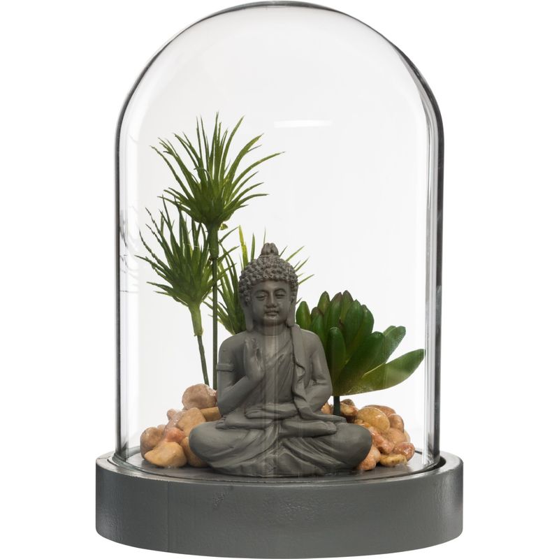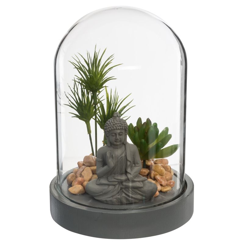 Pequeña decoración exterior - Jardín Zen bajo Campana ""Buda"" 20cm Gris Materiales: Vidrio, Poliresina y MDF