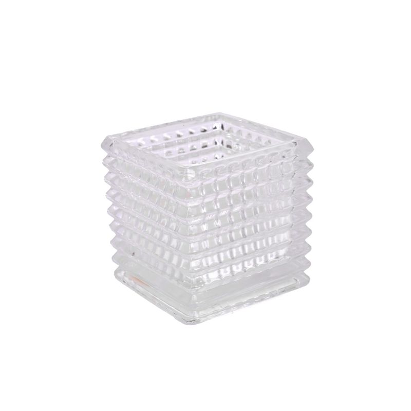 Este jarrón multiuso de vidrio de 9x9x9 cm destaca por su diseño cuadrado y moderno. La textura de cuadros y franjas horizontales aporta un detalle decorativo único, ideal tanto para colocar flores como para usarlo como porta velas. Su estilo versátil permite integrarlo en distintos ambientes, aportando elegancia y un toque contemporáneo a la decoración.