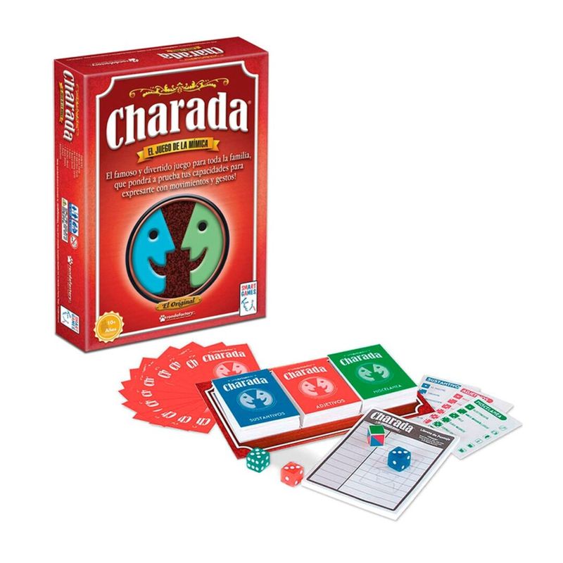 este original y divertido pasatiempo de expresión corporal une el humor, la mímica, el azar y la competencia. Charada no tiene límite de jugadores y podrás definir el tiempo de duración en cada juego. Lanza los dados y busca en las tarjetas azules de sustantivos y en las rojas de adjetivos, la combinación que tendrás que representar para el público, pero si los dados te indican el color verde, las tarjetas de miscelánea te harán actuar series de televisión, famosos personajes y más.