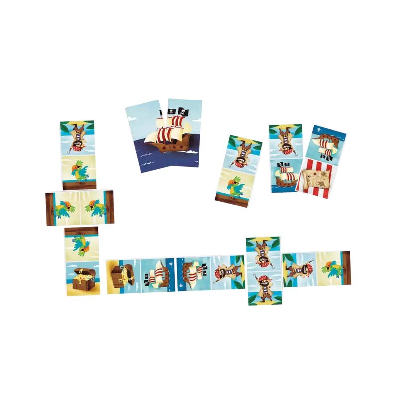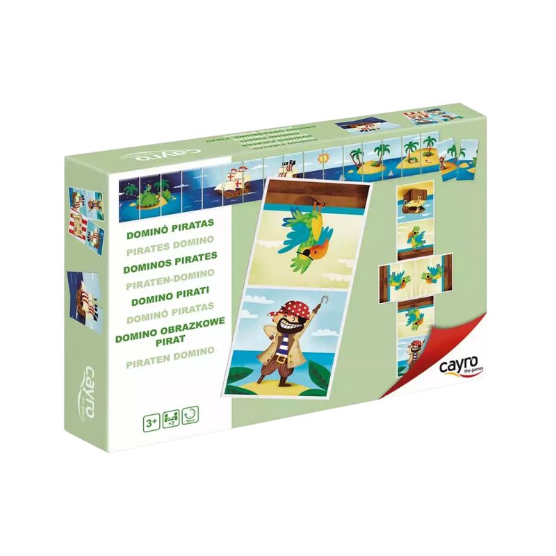 Incluye 1 caja de almacenaje y 28 piezas de dominó reversibles con imágenes de piratas a todo color. Cada ficha mide aproximadamente 12 cm de largo y 6 cm de ancho. La caja de almacenaje tiene dimensiones aproximadas de 15 cm de largo, 21 cm de ancho y 4 cm de fondo. La matriz de colores puede cambiar dependiendo de la resolución y el brillo de cada monitor.