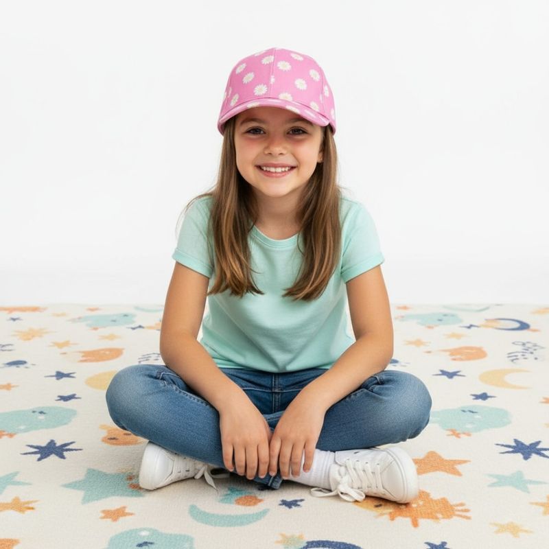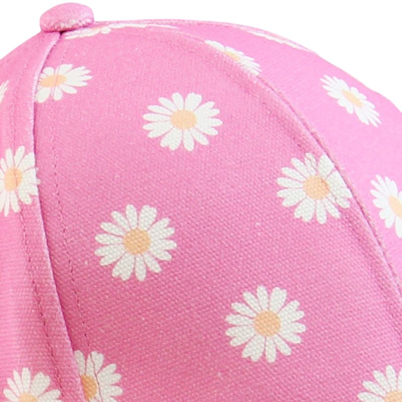 Este kepi destaca por su color rosa con estampado integral de margaritas blancas con centros amarillos, ofreciendo un diseño dulce y vibrante que resalta la personalidad infantil. La visera curvada aporta protección solar mientras mantiene un estilo moderno y femenino, y el botón en la parte superior añade un detalle clásico de la estética bucket hat.