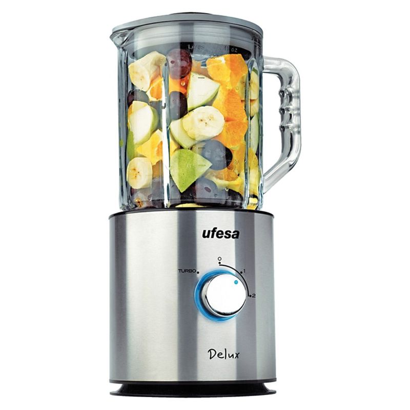 Jarra de vidrio con cierre hermético y ventana para verter ingredientes, y tapón dosificador.