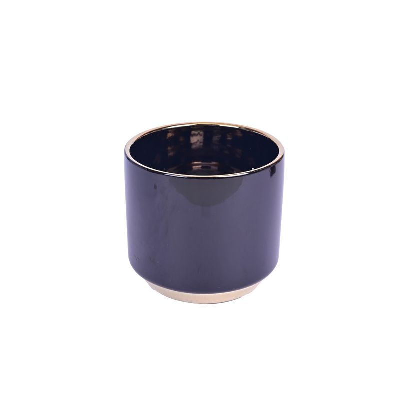 Macetero de cerámica en color negro con acabado brillante, combinado con detalles dorados en el borde y la base. Su forma cilíndrica y diseño minimalista aportan un toque elegante y moderno a cualquier espacio interior.