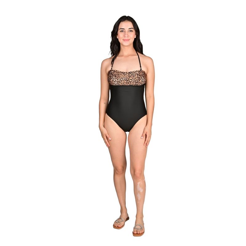 La Malla Combinado Estampado Byn Negro Mujer Mix & Match es un traje de baño de una pieza que combina elegancia y modernidad. Su diseño de bloques de color combina un cuerpo negro con una sección superior tipo bandeau decorada con estampado de leopardo, aportando un toque audaz y sofisticado. Los tirantes halter de cordón fino que se atan al cuello permiten un ajuste personalizado, mientras que la espalda con escote bajo garantiza comodidad y libertad de movimiento. Esta malla está disponible en talles especiales, ofreciendo opciones para diferentes tipos de cuerpo.