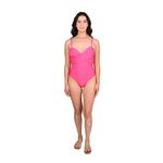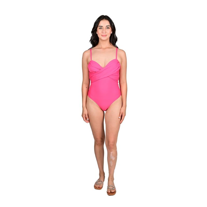 Disfrutá del verano con esta malla enteriza rosa de Mix & Match, diseñada para realzar la figura con su escote tipo wrap cruzado y fruncido central en el busto. La espalda presenta un delicado corte con lazos ajustables para anudar, que aportan un toque femenino y personalizado. Su corte de pierna alto estiliza la silueta, brindando una apariencia moderna y favorecedora.