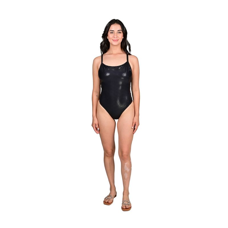 La Malla Textura con Brillos 218 Escote Redondeado Negro Mujer Mix & Match es un traje de baño entero que combina sofisticación y estilo moderno. Su textura brillante con efecto de escamas le da un acabado elegante y llamativo, perfecto para destacar en la playa o la pileta. Presenta un escote redondeado que aporta feminidad, mientras que los tirantes finos cruzados en la espalda descubierta generan un look delicado y estilizado, permitiendo libertad de movimiento y ajuste cómodo. Su color negro liso asegura versatilidad y facilidad para combinar con accesorios.