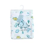 La manta Tiny Tots es perfecta para envolver al bebé durante siestas, juegos supervisados o paseos cortos. Su textura afelpada proporciona calidez y suavidad, mientras que el bordado de dinosaurio y el mensaje “HELLO WORLD” agregan un toque lúdico y tierno que acompañará al bebé en sus momentos de descanso y exploración.