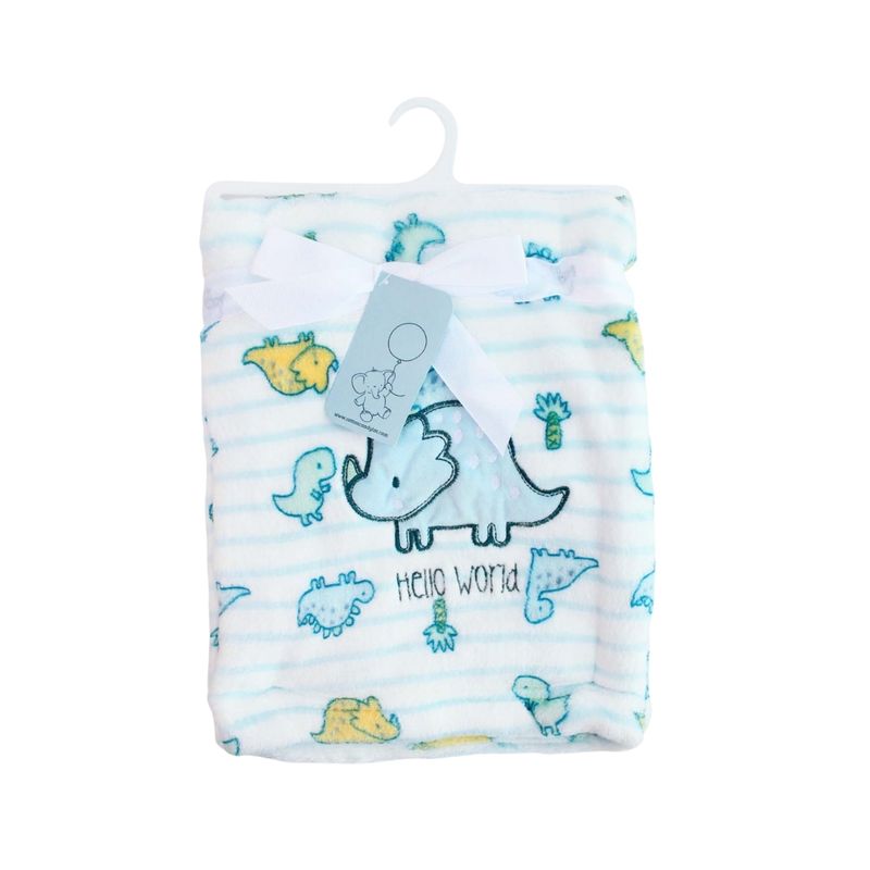Descubrí la manta Tiny Tots, especialmente diseñada para bebés varones, que combina suavidad, diversión y estilo. Esta manta afelpada presenta un estampado de rayas celestes con dinosaurios en tonos azul y amarillo, y en el centro cuenta con un bordado de dinosaurio acompañado del mensaje “HELLO WORLD”, creando un diseño alegre y atractivo. Ideal para acompañar al bebé durante siestas, paseos en cochecito o momentos de descanso en la cuna"La medida es de aproximadamente 30x40 cm, ideal para quienes buscan un tamaño versátil"