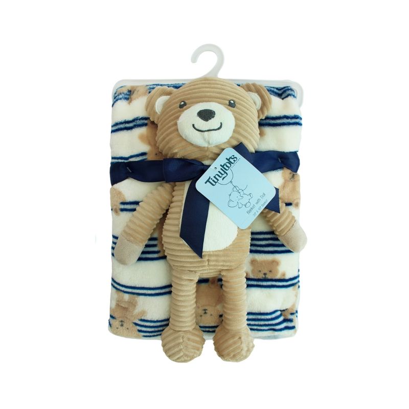 Descubrí el set de regalo Tiny Tots, pensado especialmente para bebés varones, que combina ternura, suavidad y estilo. Este set incluye una manta con diseño de rayas y estampado de osos en tonos crema y azul marino, perfecta para acompañar al bebé en sus momentos de descanso. Acompaña la manta un peluche de oso de pana color camel, que aporta un toque adorable y reconfortante. Ambas piezas vienen presentadas elegantemente con un lazo azul, haciendo de este set un regalo ideal para baby shower, nacimiento o para la cuna. "La medida es de aproximadamente 30x40 cm, ideal para quienes buscan un tamaño versátil"