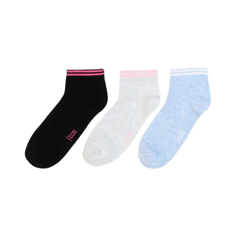 Este pack de tres medias tobilleras para niña combina comodidad y estilo juvenil, ideal para adolescentes que buscan prendas prácticas y modernas. Cada par tiene un corte bajo tipo tobillo, perfecto para usar con shorts, jeans o pantalones deportivos, aportando un look casual y dinámico. Los diseños incluyen: uno negro con borde a rayas rosa/negro, uno gris jaspeado con borde rosa claro y uno azul claro con borde a rayas blancas. Además, todas las medias cuentan con el nombre “Ficcus” en el lateral, destacando la marca y añadiendo un toque moderno.