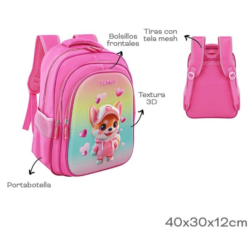 Cuenta con un tamaño práctico para el día a día, con dimensiones aproximadas de 40 cm de alto, 30 cm de ancho y 12 cm de profundidad. Ofrece espacio suficiente para llevar cuadernos, útiles y accesorios personales.