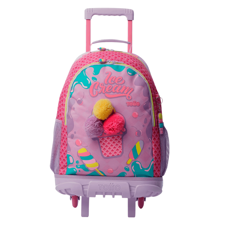 Mochila grande con ruedas de la colección Ice Pop, diseñada para añadir un toque de diversión a cada día. Presenta un estampado en puff y pom pom en la parte frontal que captura la esencia de los helados.