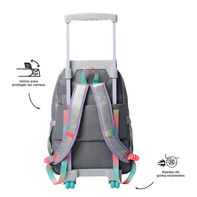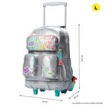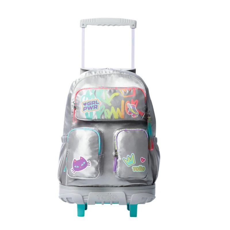 La mochila con ruedas para niña Girl Power L es ideal para quienes necesitan llevar todo al colegio con facilidad. Fabricada en poliéster metalizado, tiene un compartimento principal con doble cremallera, correas acolchadas y bolsillos laterales porta botellas. Los bolsillos frontales ofrecen espacio extra, mientras que los estampados en el frente y el llavero incluido le añaden un toque único.