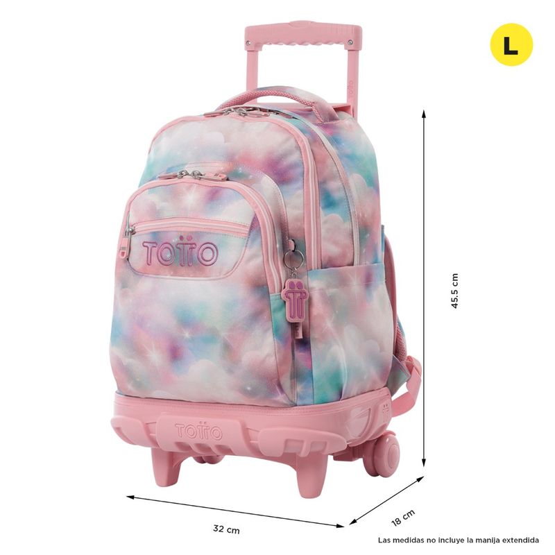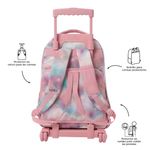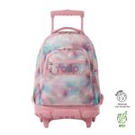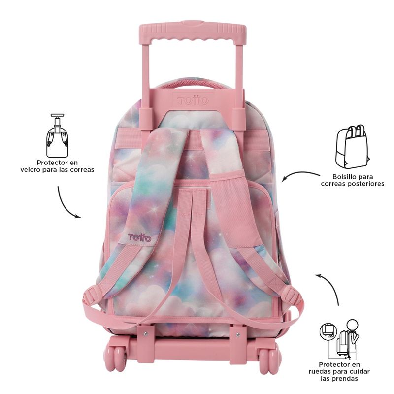 Fabricado en lona RPET de 13 botellas recicladas, cuenta con porta PC de 15.4", ruedas de goma resistentes, bómper protector y manija telescópica. Incluye bolsillo en la correa y protector para ruedas. ¡Perfecto para el colegio!