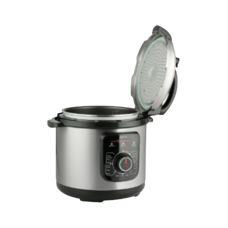 Este modelo cuenta con control mecánico de presión y 8 funciones preconfiguradas: cocción a presión, lenta, al vapor y sofreír, entre otras, que facilitan el proceso de preparación de alimentos. Su tapa de cierre hermético incorpora 8 niveles de seguridad, garantizando un uso seguro y protegido en todo momento. Las luces indicadoras muestran el estado de cocción, permitiendo un seguimiento fácil y preciso de los alimentos.